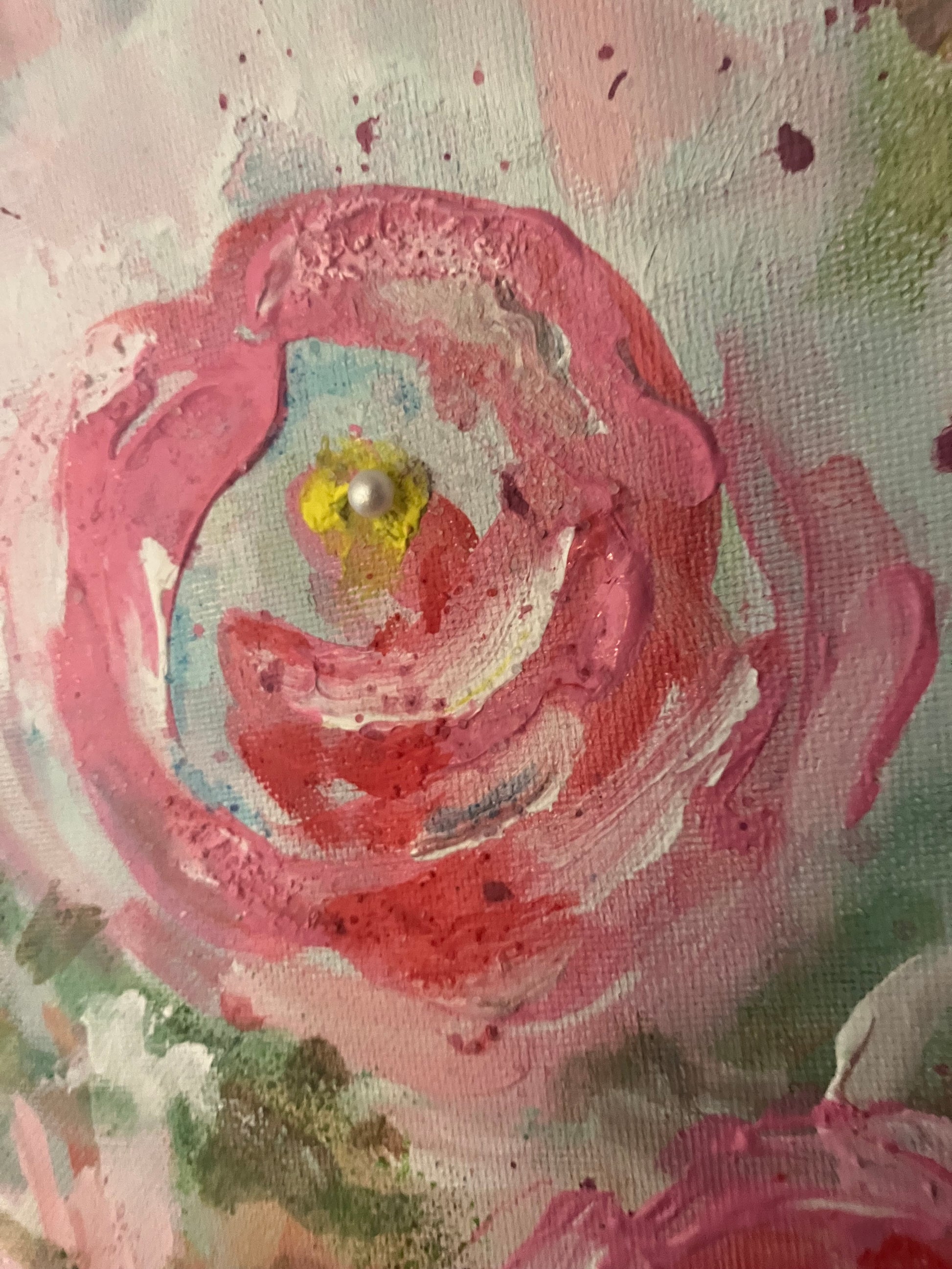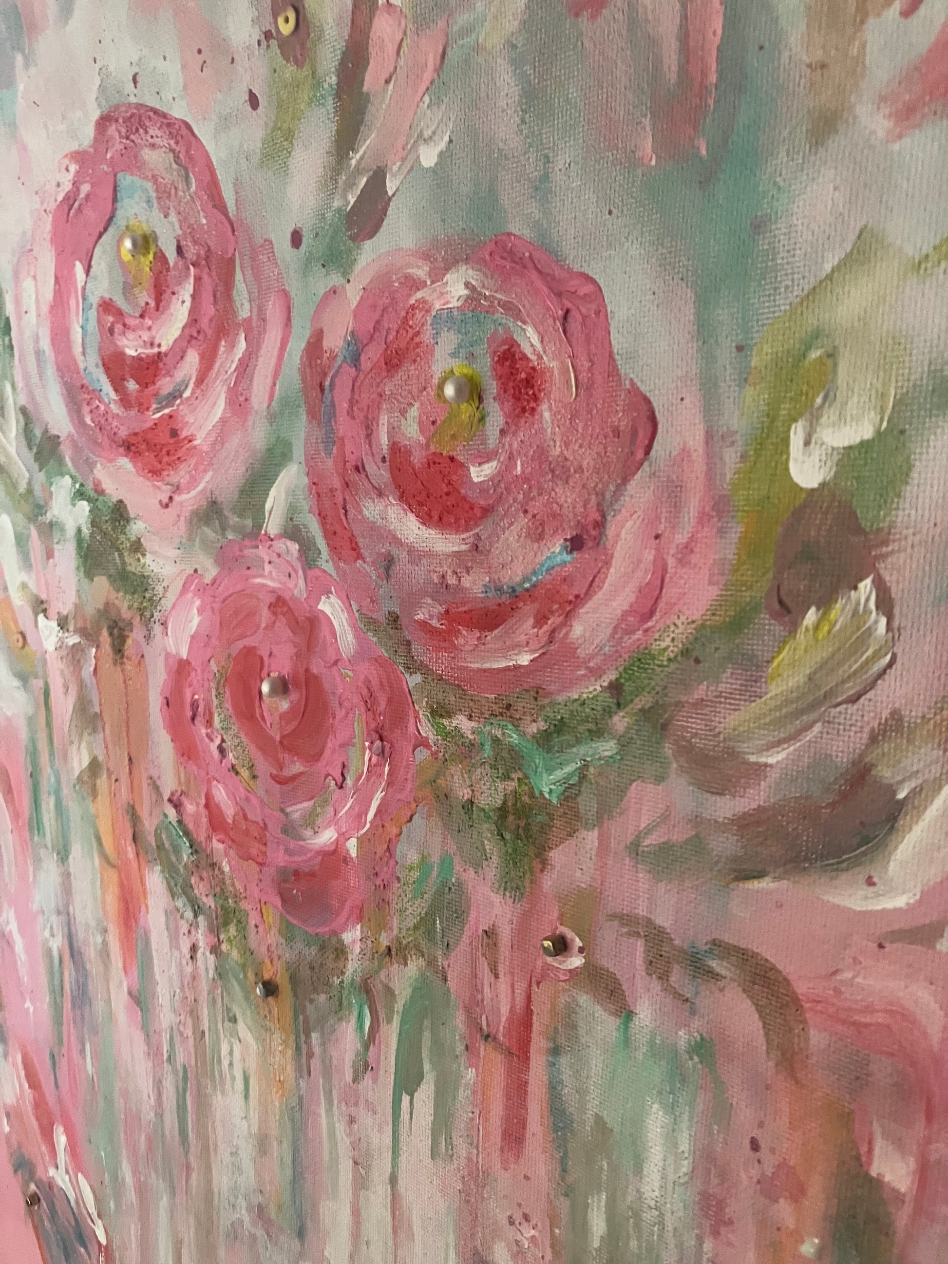 Medium Original pink rose painting, embellished with pearls and gold beads.